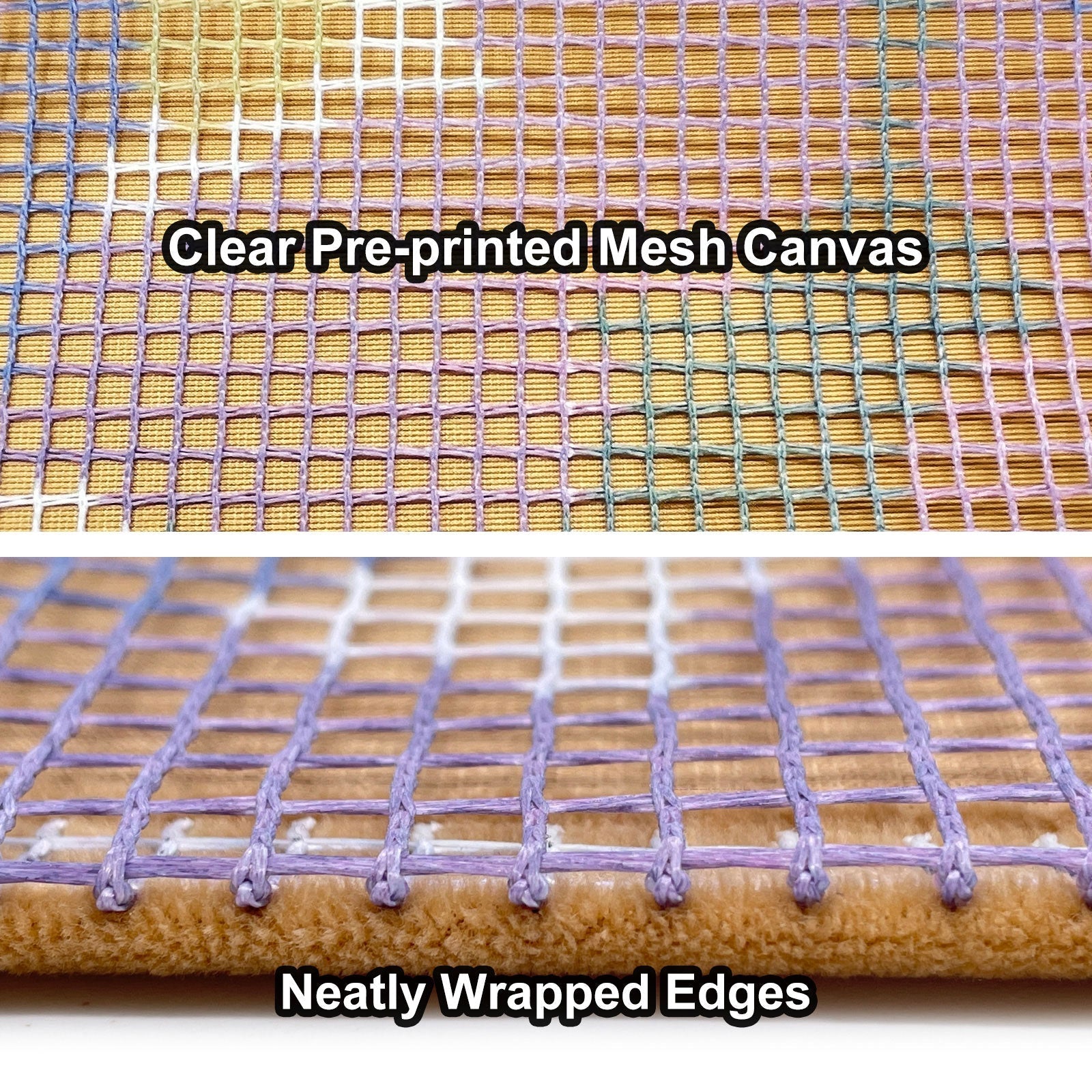 - The canvas uses a color-printed mesh. Due to the toughness of the material, the actual mesh count may differ slightly from the instruction chart. The mesh on each side may have 2–4 fewer lines. Please compare the colors on the printed mesh with the instruction chart before starting your project. If you are particular about this, you may contact our customer service to request a mesh without printed patterns.